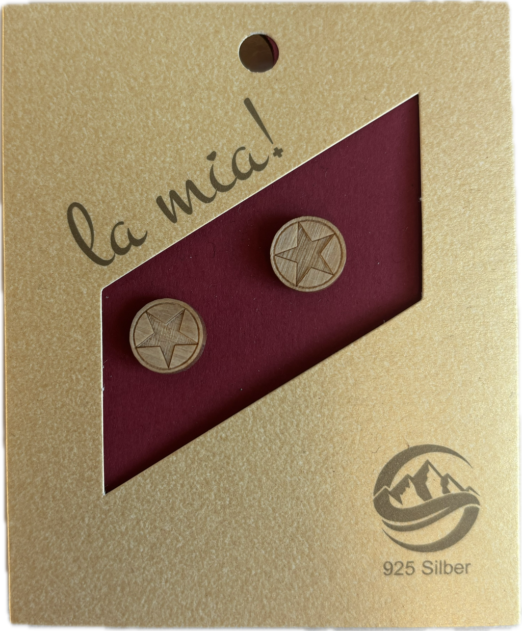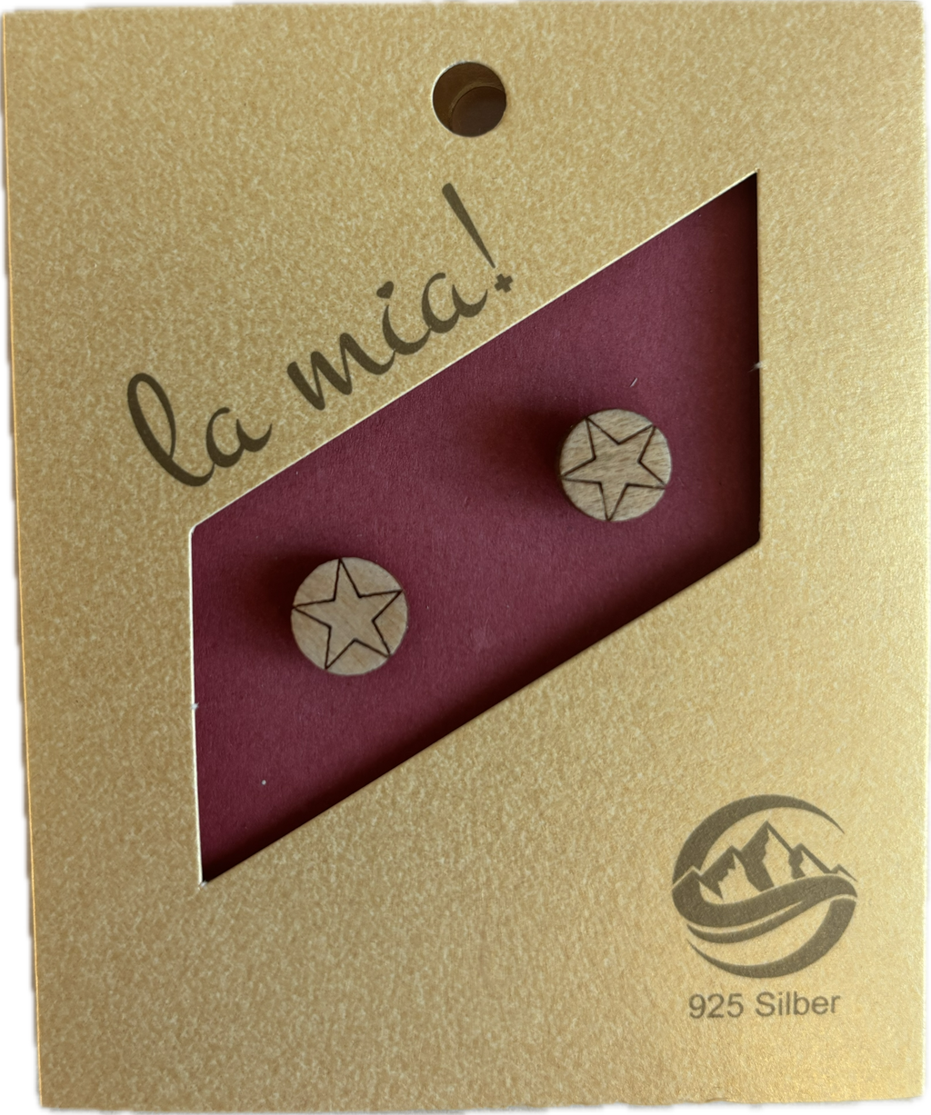 Elegante Ohrstecker mit handverarbeiteten Sternen aus hochwertigem Ahornholz, kombiniert mit 925er Silber in rhodinierter Ausführung. Diese Schweizer Handwerkskunst verbindet natürliche Holzstrukturen mit glänzendem Edelmetall zu zeitlosen Accessoires. Die sorgfältig gefertigten Sterne präsentieren sich in verschiedenen Varianten und eignen sich perfekt für alltäglichen Gebrauch oder besondere Anlässe. Jedes Paar besticht durch die charakteristische Maserung des Holzes und die hochwertige Verarbeitung.